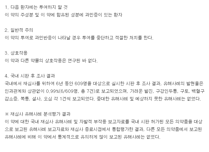 약물 복용 시 약품 설명서를 꼼꼼히 읽어 보길 바라며, 조금이라도 이상한 반응이 나타난다면 약품 복용을 즉시 멈추시고 빠른 시일 내에 의사와 진료와 상담을 통해 질병을 치료하시기 바랍니다.